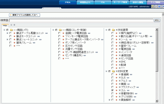 辞書構築機能で予め構築したFMEA用の解析入口から、FMEAの解析アイテムを選択します。
