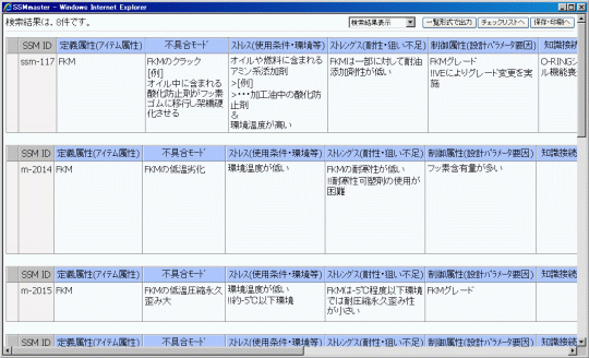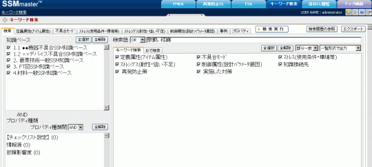 キーワード検索では、SSM知識を自由なキーワードで検索することができます。検索結果はチェックリストに出力したり、印刷したりすることができます。またキーワードを直接入力して検索するほかに、画面上部に配置されているタブから不具合事例や定義属性、不具合モードなどの語句を絞り込んで検索することが可能です。