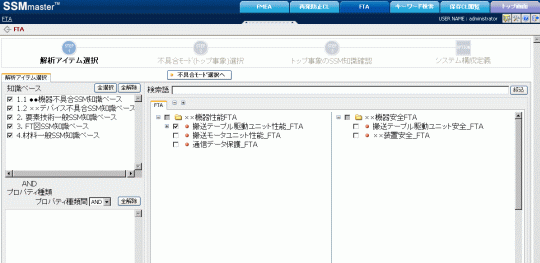 辞書構築機能で予め構築したFTA用の解析入口から、FTAの対象となるシステムを選択します。