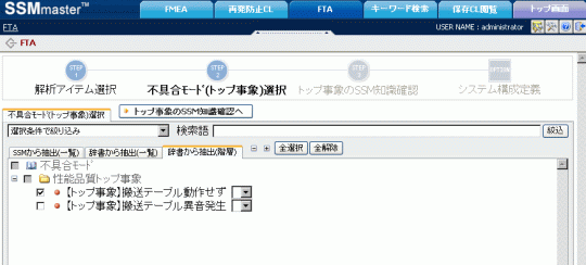 解析するトップ事象となる不具合モードを選択します。候補となるトップ事象は、SSM知識ベースから自動的に抽出します。