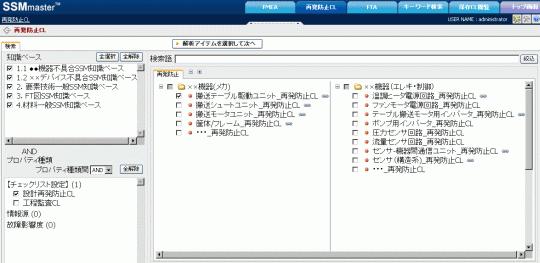 辞書構築機能で予め構築した再発防止チェックリスト用の解析入口から、チェックリストの対象となるユニットを選択します。過去トラブルの知識のみを絞込むので、知識絞込み用のプロパティ欄では「設計再発防止CL」が予めチェックされています。(この点が、広く一般知識を検索に含めたFMEAの進め方と異なります。)