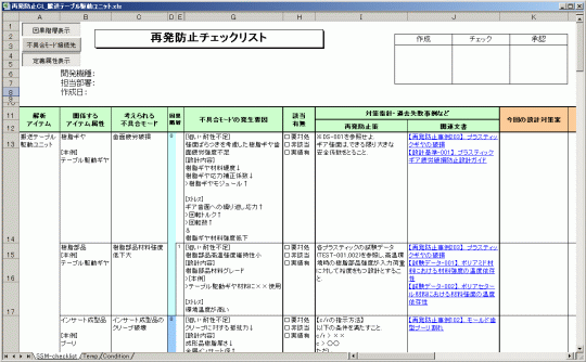 Excelマクロを利用し、検索結果の知識を予めデザインした再発防止チェックリストのテンプレートに自動的に出力させます。この処理によって、知識ベースへの知識増加に伴い、動的にチェックリストを作成することができます。(別部署の知識の水平展開まで狙った再発防止チェックリストを運用する場合、この方法で非常に効率的に運用することができます。)