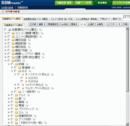 例えば、定義属性においては、電気回路、機器制御、部品、工法、材料などのカテゴリ別に、SSM知識で作成した定義属性の上位下位関係を整理することができます。また、材料 > 鉄鋼 > SUS > オーステナイト系SUS > SUS304 などのように上下関係を階層化し、FMEAのSTEP2や再発防止チェックリストでのSTEP2で語句一覧を分かりやすく展開表示させておくことが可能です。