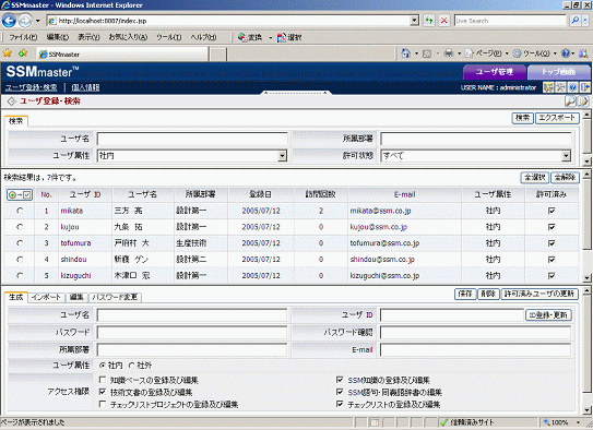SSMmasterを利用するユーザ情報を閲覧・登録・編集ができます。管理者アカウントでは、ユーザ情報の閲覧、登録・編集することができ、それ以外の管理者権限のないユーザは、SSMmasterに登録されているユーザ情報を閲覧することができます。